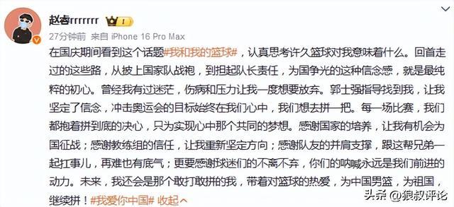 赵睿表示:认真思考许久篮球对我意味着什么。回首走过的这些路,从披上国家队战袍,到担起队长责任,为国争光的这种信念感,就是最纯粹的初心。
