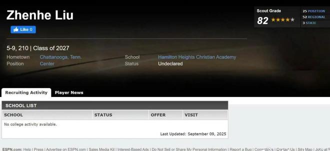 不久前有媒体发布消息,在美国闯荡的年轻球员刘朕赫被ESPN评为全美四星高中生。此前在全美中锋排名中,刘朕赫位列第十七。