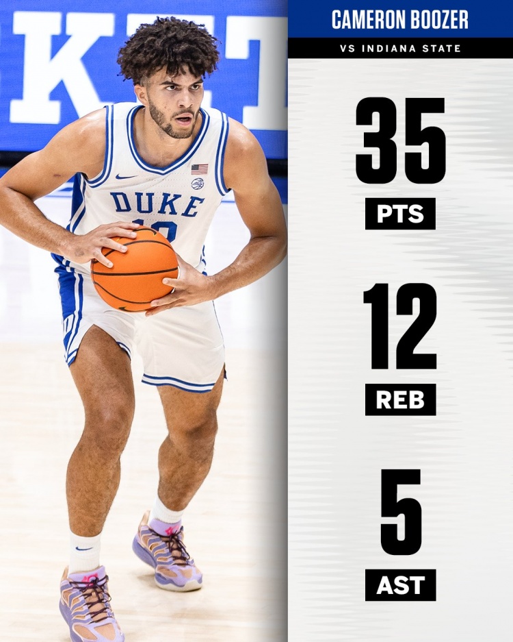 11月17日讯 在此前的一场NCAA比赛中,杜克大学100-62大胜印第安纳州立大学。卡梅隆·布泽尔狂砍35分12篮板5助攻3抢断3盖帽。而这仅仅是他代表杜克打的第四场正式比赛。