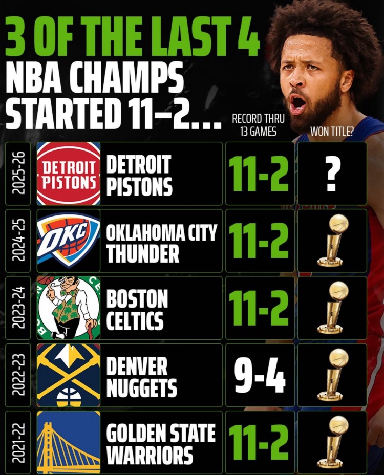 11月17日讯 活塞媒体Pistons Talk晒出了一个惊人的巧合数据,近4年的NBA总冠军中,有三支球队在当赛季开局都是11胜2负,唯有22-23赛季的掘金例外。