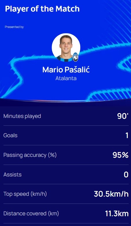 本场比赛帕萨利奇打进绝杀,全场跑动距离11.3km,传球成功率95%,赛后他也当选欧冠官方本场最佳球员。