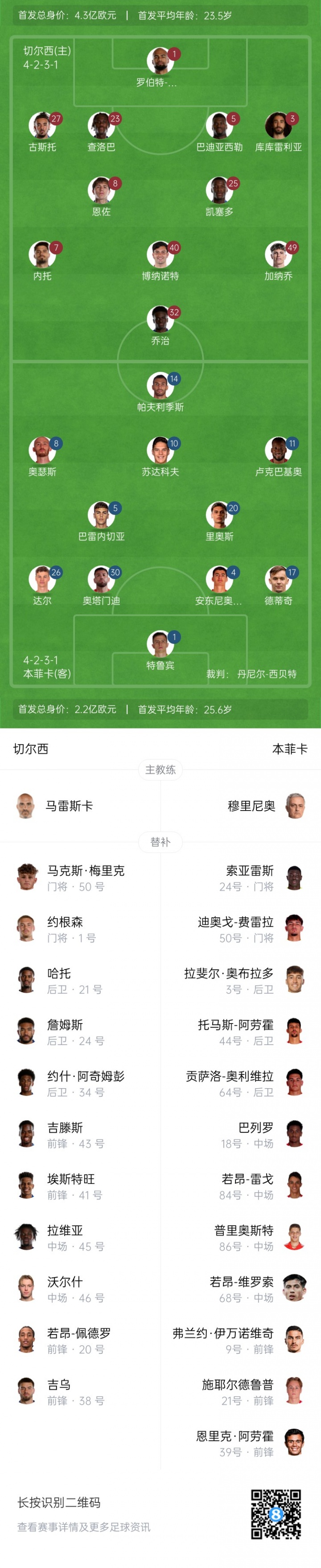 切尔西首发:1-桑切斯、3-库库雷利亚、5-巴迪亚西勒、23-查洛巴、27-古斯托、8-恩佐、25-凯塞多、40-博纳诺特、7-内托、32-乔治、49-加纳乔