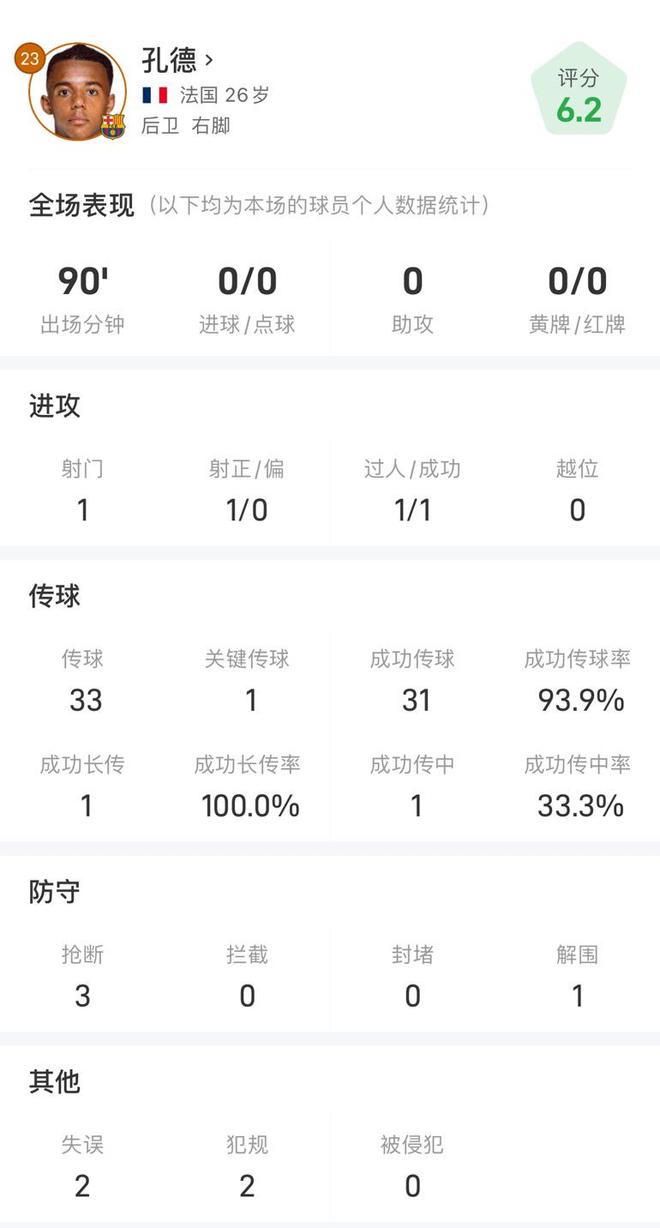 孔德vs塞维利亚数据:2次失误,3次抢断,1次关键传球
