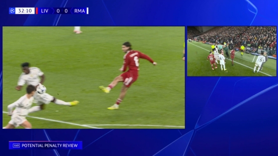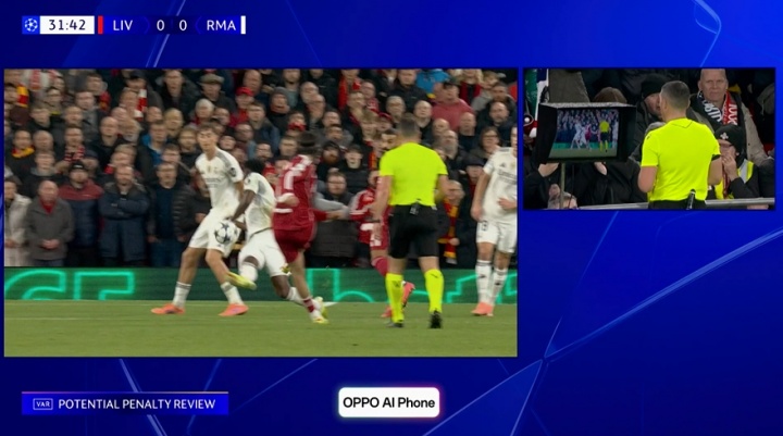 11月05日讯 利物浦vs皇马第31分钟,索博打门击中琼阿梅尼手臂,裁判检查点球,VAR介入。