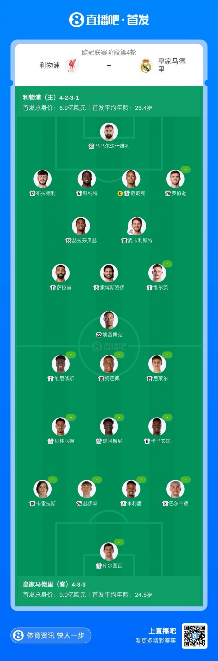 利物浦vs皇马首发:阿诺德替补!姆巴佩、萨拉赫、维尔茨先发