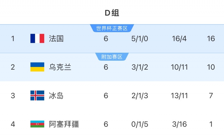 世欧预D组积分榜:法国6轮不败6分居首,乌克兰末轮胜冰岛锁定第2