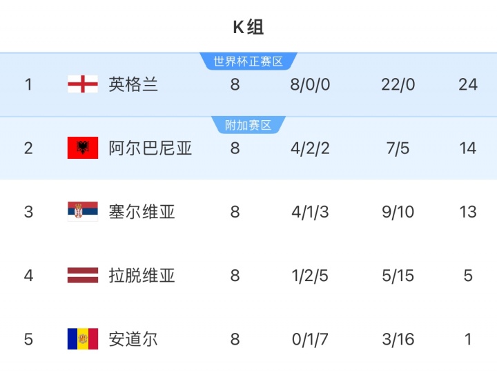 11月17日讯 世预赛欧洲区小组赛,英格兰8轮比赛全部结束,他们狂轰22球0失球锁定K组第一,全胜收官!